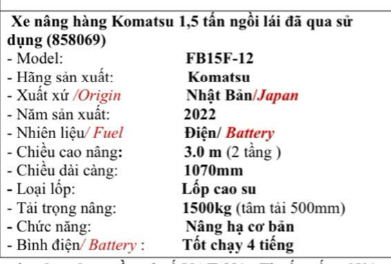 Xe nâng điện KomatsuXe nâng điện ngồi lái Komatsu 1.5 tấn FB15EX-11 cũ5/5 - (1 bình chọn)