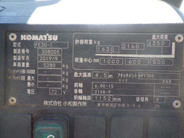 Xe nâng điện Komatsu Model: FE30-1 sx 2019 – là dòng xe nâng điện ngồi lái 3 tấn. Nâng cao 4.5m, gật gù (Higed fork) lốp trước đặc kép đôi, lốp sau đơn, chạy 2077 h. Bình ắc quy khô 420Ah/72V pin khô sạc nhanh